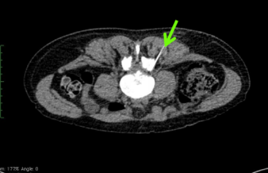 透過CT X 光機導引下, 進行脊椎神經根注射
