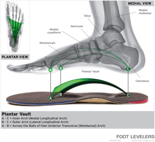 正常雙足由三條足弓支撐著:內側縱弓,外側縱弓及橫弓。主要功能為承受全身的重量、緩衝震蕩、提供彈力,以及被免足底神經和血管受壓等。一般鞋墊只承托內腳弓,而 Foot Levelers 的度腳訂製鞋墊為三點支撐結構,全面承托左、中、右三個腳弓位。整體鞋墊薄且軟硬適中,腳弓位採用硬挺物料,舒適而又能提供足夠的承托力。