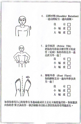 倘若找出這幾項中有不平衡發育時,可以使兒童能及早得到冶療,而定期檢查昰預防脊骨側彎的最佳途徑。