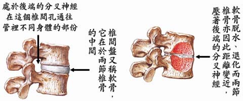 椎間盤 ( 軟骨 ) 在上下兩節脊椎骨之間,由內層的骨髓核 ( 啫喱狀物 ) 及外層的纖維環所構成。 椎間盤的作用是吸收脊椎所承受的壓力,亦有避震的作用,當我們擺動身體,向前或向後彎腰時, 軟骨亦同時作出不同的形狀來配合身體的動作。但隨著年齝增長及長期身體負重,到了三十歲左右, 髓核會開始脫水和變質,吸收壓力的能力亦會降低,同時纖維環也開始出現退化。當我們不覺地做 出一些不當的姿勢或動作,便可能造成椎間盤 ( 軟骨 ) 突出。