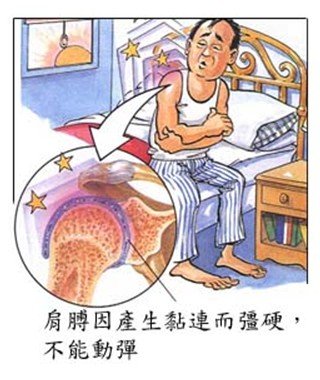 當肩膊在某些原因引致下不能活動及產生痛楚時,我們便很自然地盡量減少該肩膊活動。在這種情況下, 我們的肩膊會逐漸產生黏連而令痛楚增加及活動不能。患者不能舉手作一些簡單的動作如梳頭、舉手等等。 痛楚有刺痛感及彊硬。