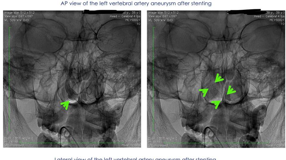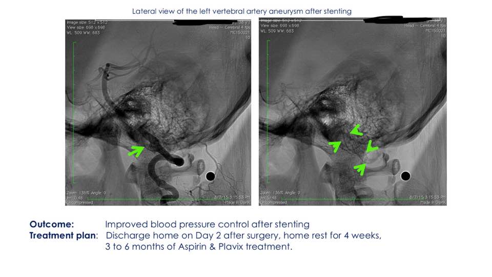Emergency minimally invasive catheter needle insertion surgery, 1 hour internal vascular treatment, implantation of blood bypass stents to divert blood into fragile cerebral aneurysms, prevent aneurysm rupture and repair blood vessels