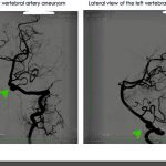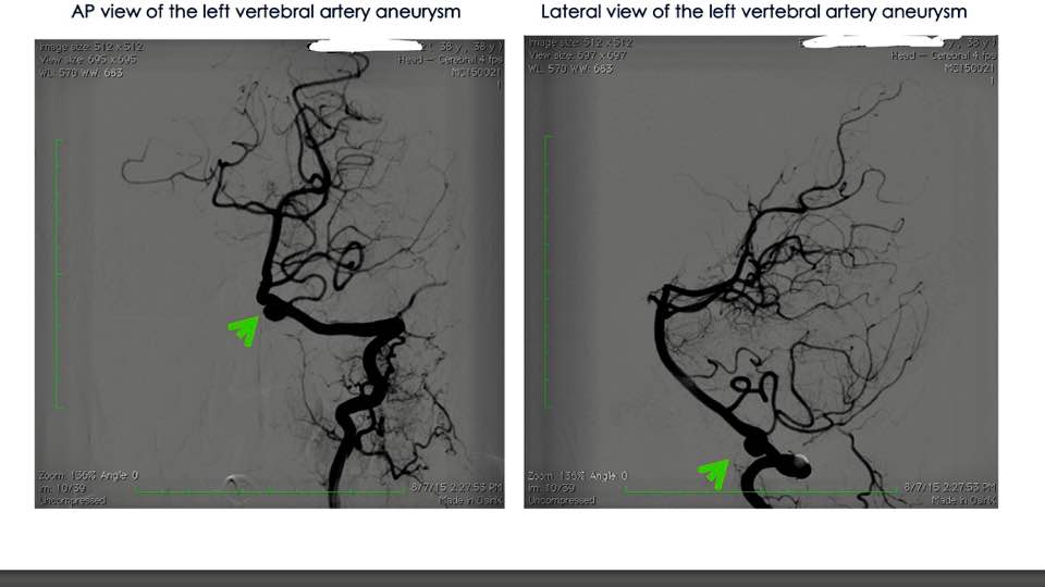 Magnetic resonance imaging showed a cerebral aneurysm of the left vertebral artery about to rupture.