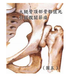 由于大腿骨顶部连接髋关节位,如大腿骨顶部骨骼怀死亦会产生髋关节痛楚。 由于该处的血液循环不 足够而引发顶部骨头怀死。 患者多数介乎于25至45岁,而40%– 70%患者最后亦会感到两边髋关节痛。 过量酒精及服用类固醇药物都会严重影响这个病症。 患者早期没有痛的征状,只是觉得髋关节有些紧硬, 到后期当大腿骨顶部完全下陷,髋关节痛的情况近似退化性关节炎的征状。 (图五)